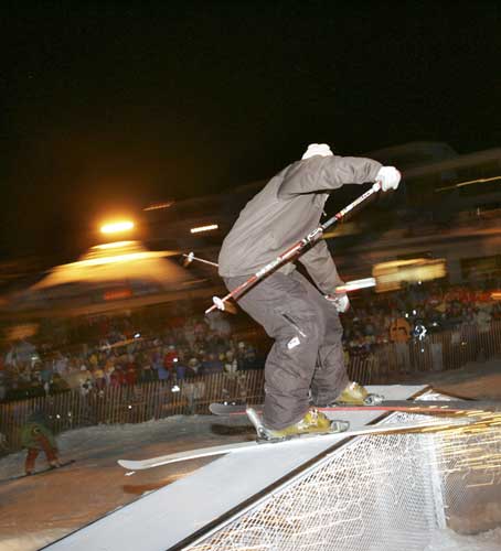 The event both kicked off the new events schedule and was an announcement of Big Sky's improved terrain park brought to the resort by park designer, Joe Pope and his crew. The newest rails were temporarily installed in the plaza area along with scaffolding for the drop-in for a one-hour jam session. Ten local skiers and ten riders were selected to participate in the rail jam, including Volkl pro Dylan Hood and local favorite rider Shane Stallings. Members of Big Sky's new MSU Freeride Team completed the rest of the talent spinning and landing tricks from two flat down rails and a flat-down-flat fun box illuminated with lights. |