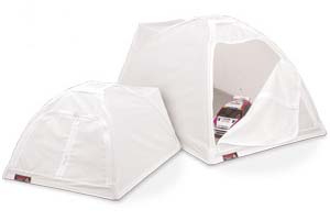 Step 2: zip the light tent, closing it. Insert the camera lens into the small hole with the zipper. Zip this hole so that the lens fits snuggly. This ensures that excess light does not accidentally enter the Photoflex Literoom. The camera should be on a tripod. Lower the front camera leg so that the camera is leaning toward the table.