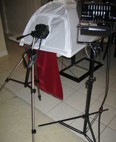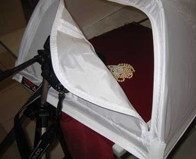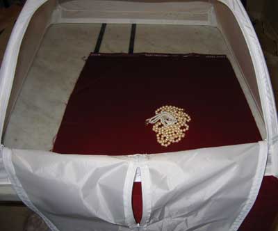 Step 1: Place the velvet sheet on top of the table. Arrange pearls to a visually pleasing manner. Assemble Photoflex Literoom and place the Literoom on top of the pearls. The bottomless nature of the Photoflex Literoom allows the photographer to shoot on virtually any surface.